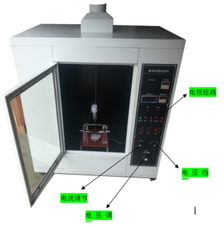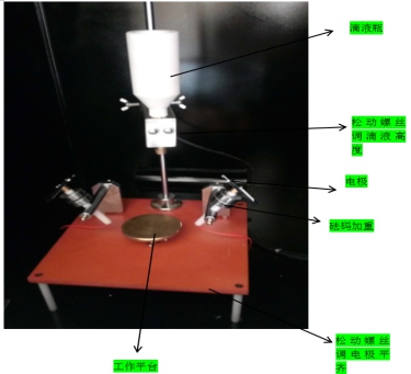 3、調(diào)好所需的滴液次數(shù)跟滴液時間,打開電源,打開照明,再放電解液的瓶子里倒點清水,拿計量杯在滴嘴下面接好,按住排液,排清清水為止,把產(chǎn)品放到測試臺,調(diào)好電極距離跟滴液高度,滴液嘴對準(zhǔn)兩個電極中間,把氯化銨配好倒進(jìn)滴嘴上面裝電解液的瓶子里,把門關(guān)好,把電壓檔位打到需要的電壓檔位,按啟動鍵,按電極短路把電壓跟電流調(diào)到需要的電壓跟電流調(diào)到1A,放開電極短路,實驗開始,中間出現(xiàn)過流跟不合格時候會報警,證明產(chǎn)品測試不合格,滴液次數(shù)到自動停。